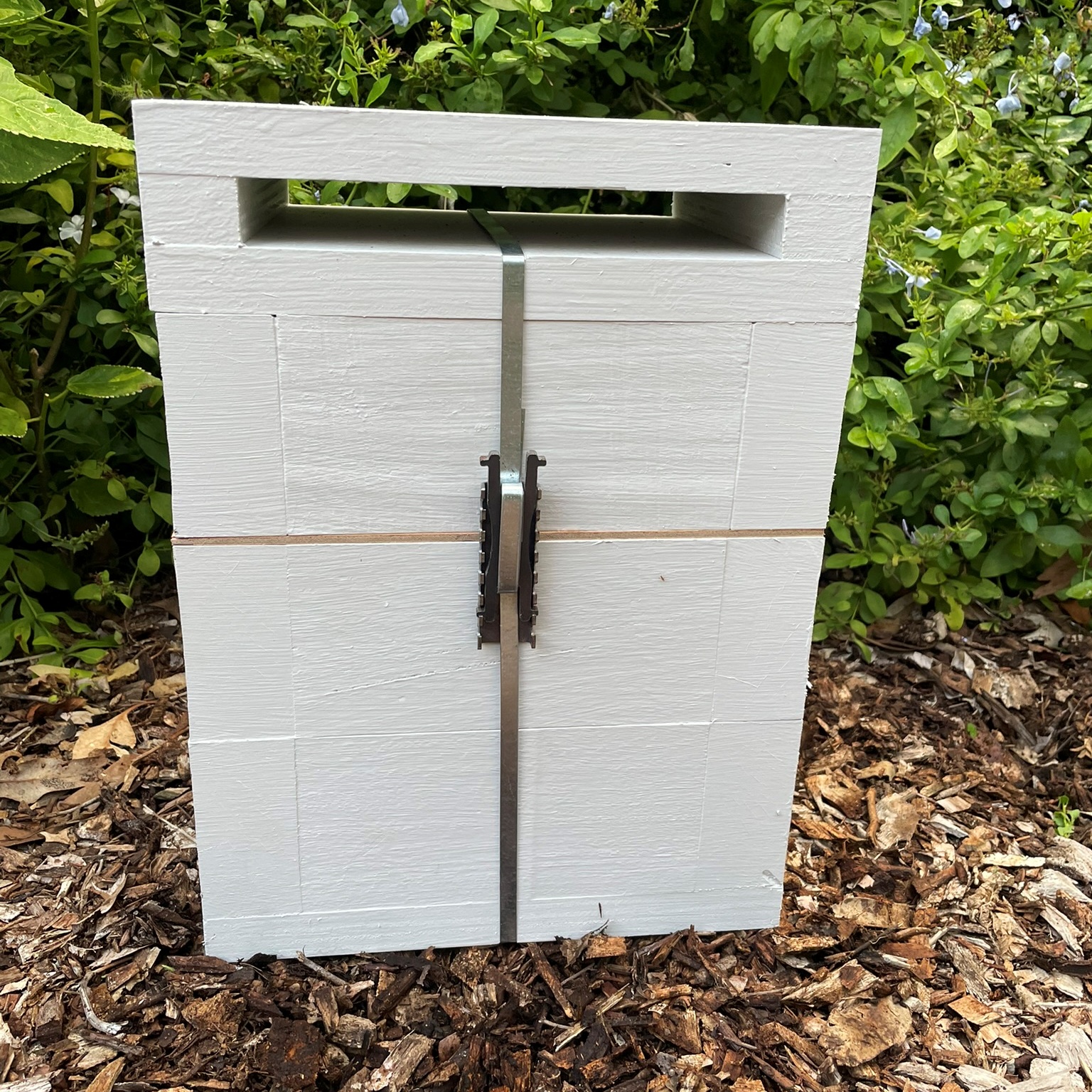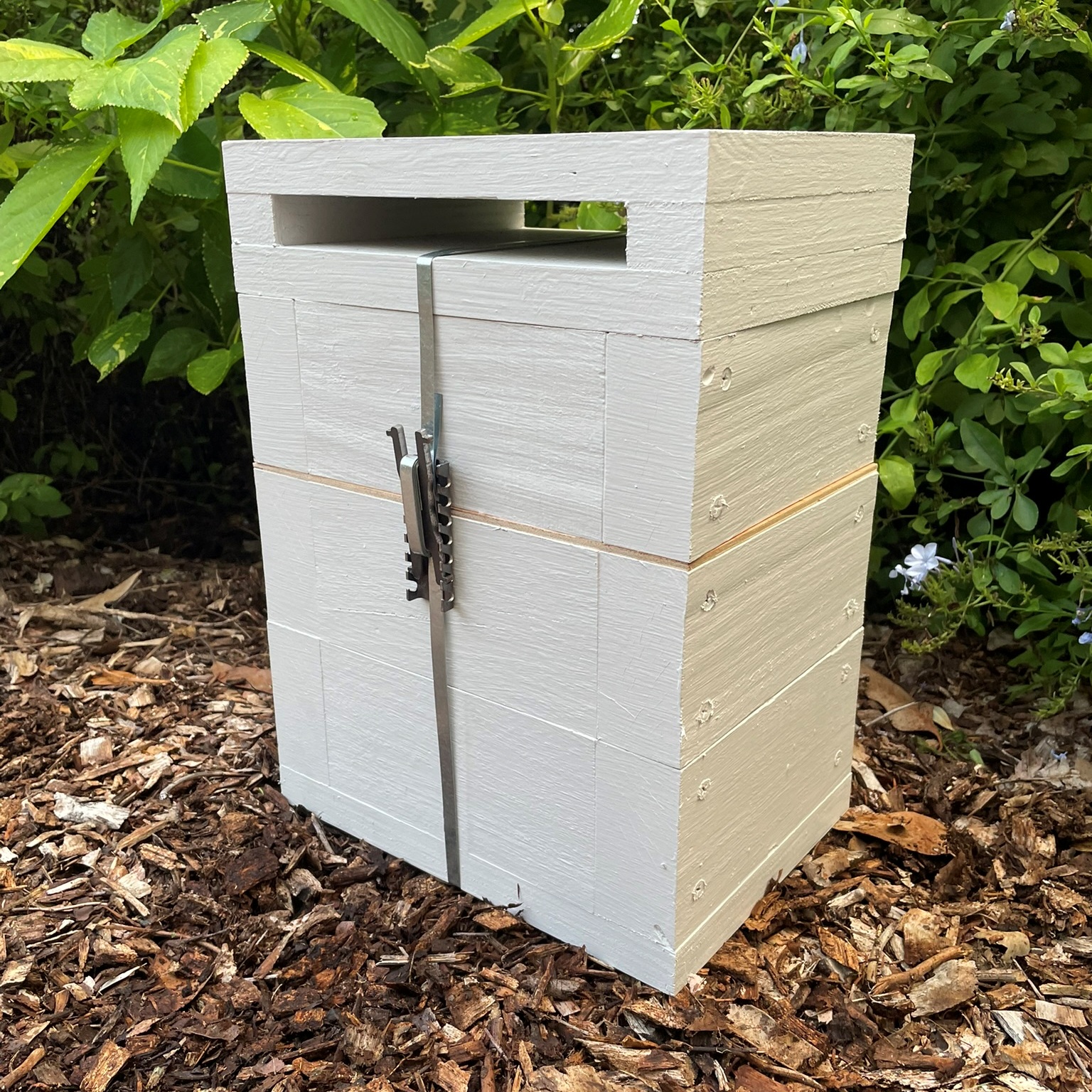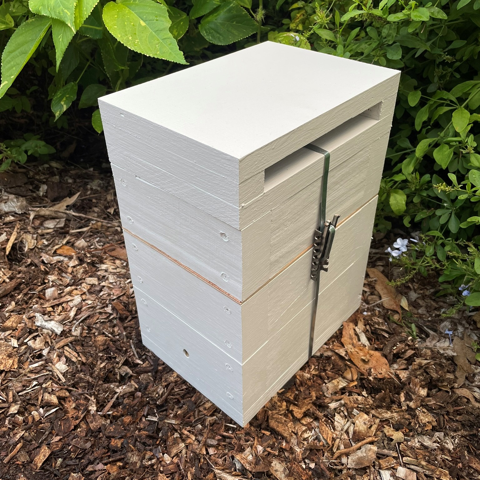 The boxes have an external size of 200 mm wide x 280 mm long. A honey box is added to the top of the double brood boxes to make a third storey. 50 mm thick Cypress Pine for durability, insulation and lightness. A bottom board is attached and the tropical lid simply sits on top. The bees will glue the whole thing together with their natural resins. A hive lock keeps it all together. The complete set-up resembles a miniature triple storey honeybee hive!